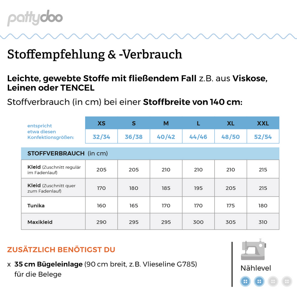 - Booklet mit Maßtabellen, Zuschnittplänen und Tipps zum Nähen