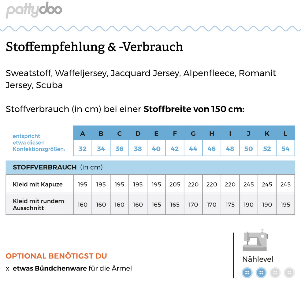 - Booklet mit Maßtabellen, Zuschnittplänen und Tipps zum Anpassen der Größen